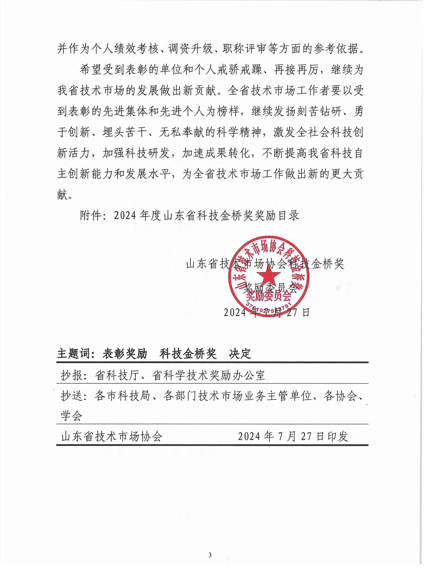 科技金橋獎是山東省科技廳備案的省內(nèi)技術(shù)市場領(lǐng)域最高獎項,本屆金橋獎重點獎勵在黃河流域生態(tài)保護和發(fā)展新質(zhì)生產(chǎn)力中推動科技成果轉(zhuǎn)化、產(chǎn)學(xué)研合作以及為我省科技大市場建設(shè)中做出突出貢獻等工作的單位、個人和項目,共評出50個優(yōu)秀項目,其中一等獎10個。